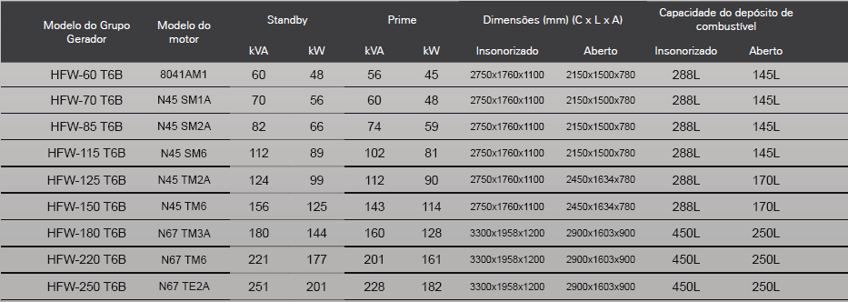 Gama de grupos de geradores equipados com motores FTP(Fiat Power Train), de conhecimento internacional e fiabilidade comprovada, com potência de 60 KVA a 250 KVA.
