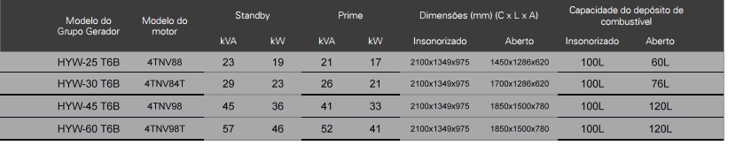 Equipamento com motor Yanmar, tecnologia japonesa de grande performance e baixo consumo, oferece potência de 25 KVA a 60 KVA