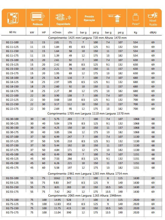 Os compressores da Série EG, representam um salto gigante em design e desempenho em cada componente projetado para obter-se confiabilidade e facilidade se manutenção. O compressor é fabricado em conformidade com os padrões internacionais aplicáveis (UL, ASME, CE e outras) e projetado de acordo com os padrões internacionais de qualidade. Esta nova geração de compressores reduz significadamente os custo operacionais e proporciona economia nos custos como retorno rápido do investimento.